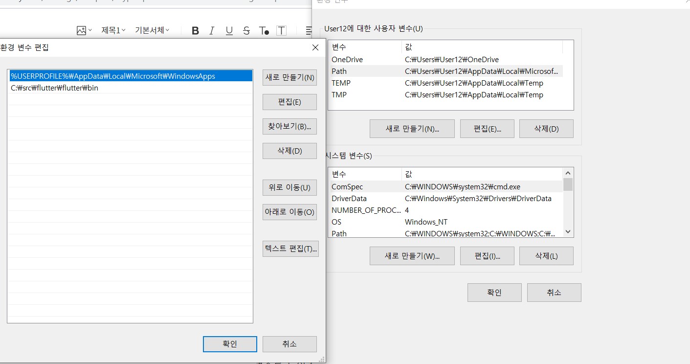 시스템변수(s) 에 읶는 path에 편집 새로만들기 C:\src\flutter\flutter\bin로 해결되었습니다