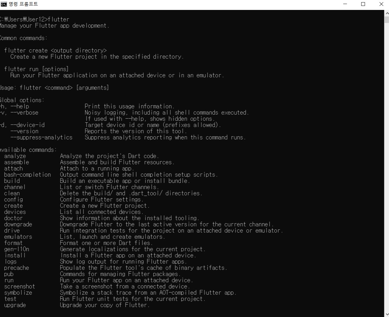 그후 cmd를 실행한후 flutter를 검색